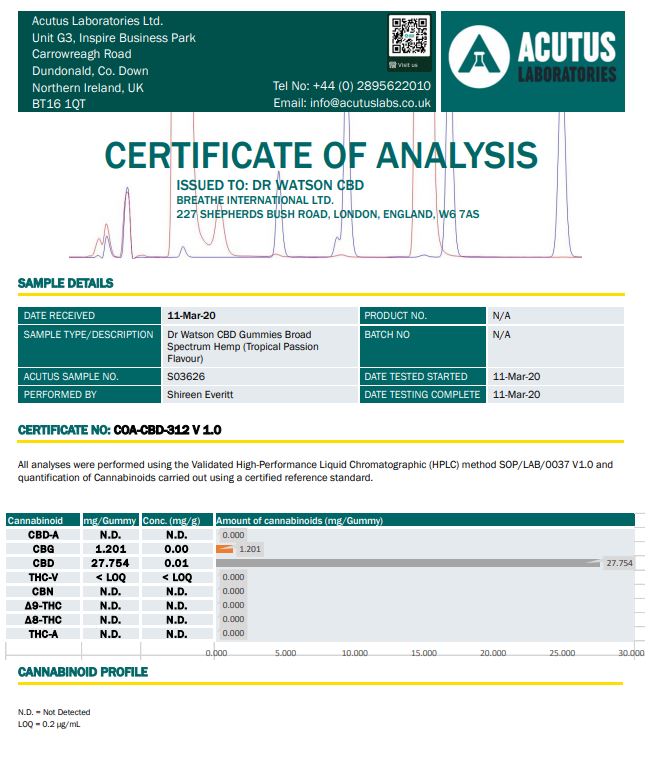 Ingredients: Fructose, sugar, syrup, water, agar, gelatin, hemp extract 25mg per sweet, (21 mg CBD, 24mg CBG), MCT coconut oil, natural passionfruit extract, citric acid, peach & mango natural flavouring.