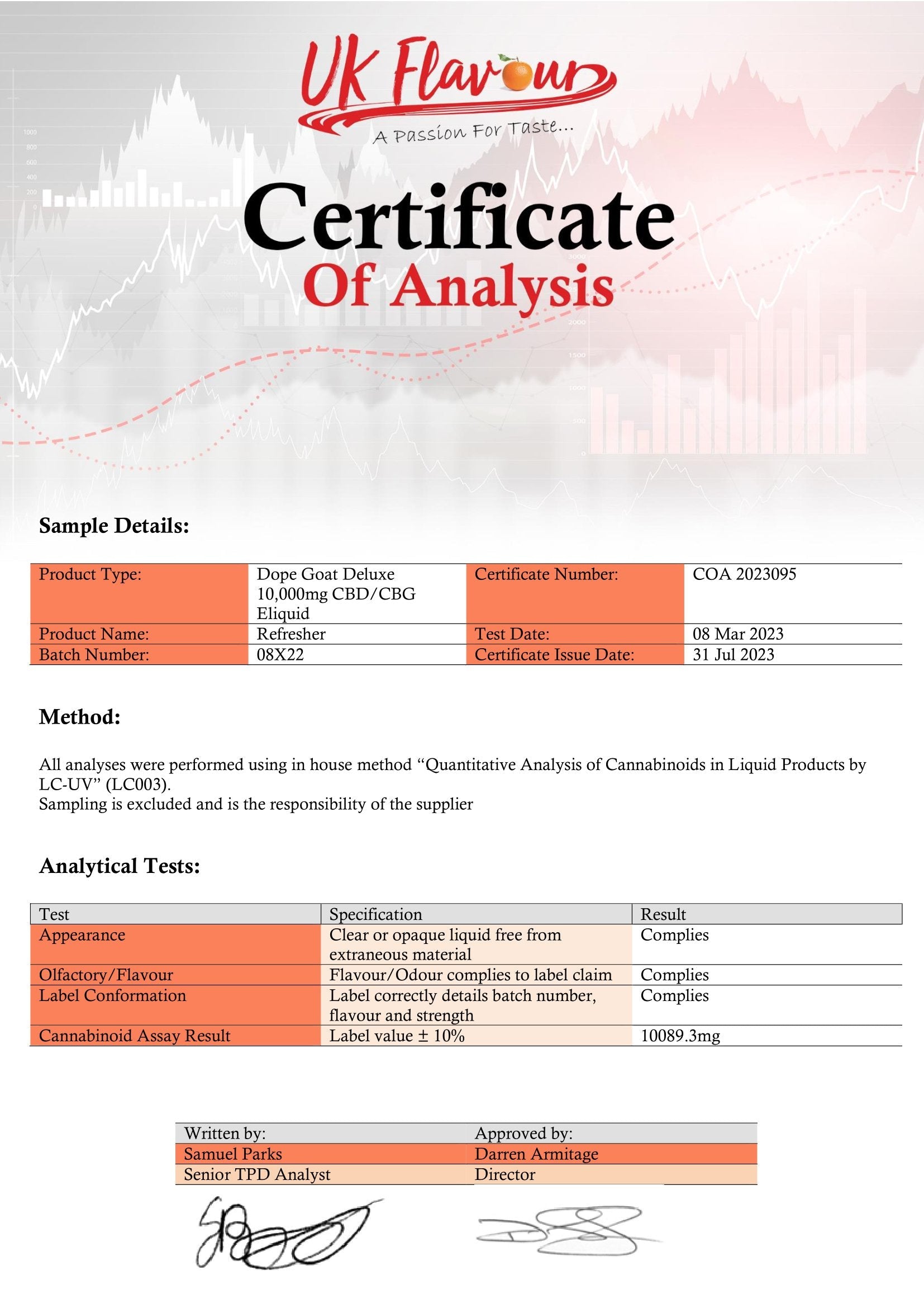From the producers of the amazing Dope Goat Drip CBD E-liquids comes the Dope Goat Deluxe range, a premium mix of CBD & CBG isolate e-liquids coming at a whopping 10,000mg (5000mg CBD and 5000mg CBG) strength. With 5 flavours, each available inside 250ml sized bottles, vapers will experience the superb tastes of Dope Goat's Deluxe range mixed at 70VG/30PG ideal for Sub-Ohm vaping pods and kits.