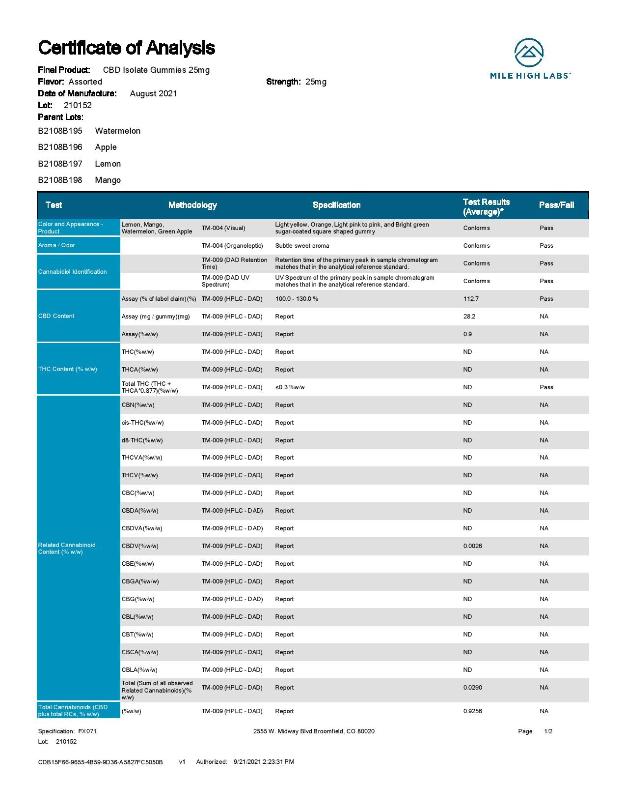 Mango Ingredients: Sugar, Light Corn Syrup, Pectin, Natural Mango Flavour, Cannabidiol (From Hemp Extract), Citric Acid, Baking Soda, Water.